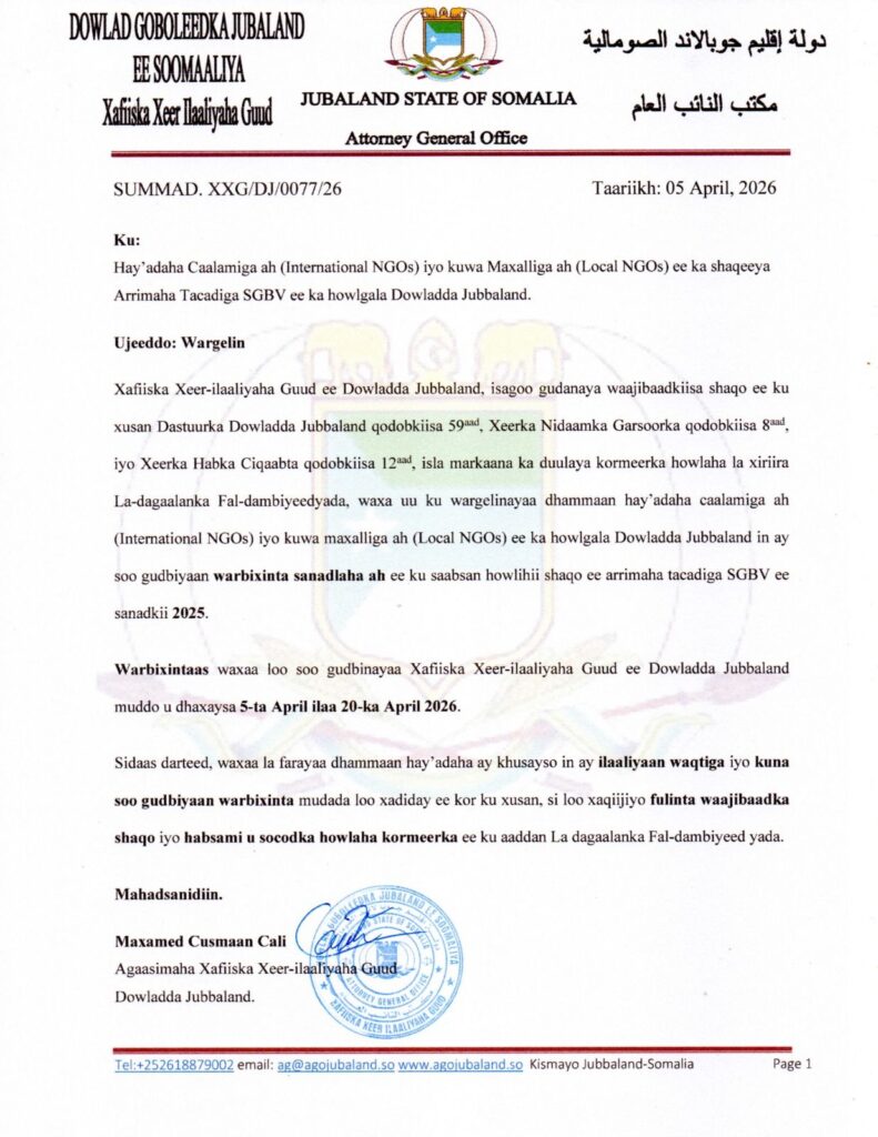 Xafiisku wuxuu ogaysiinayaa dhammaan Hay’adaha Caalamiga ah iyo kuwa Maxalliga ah ee ka hawlgala deegaannada Jubbaland, kuwaas oo fuliya mashruucyada la xiriira ka hortagga iyo wax ka qabashada tacadiga jinsiga, inay waajib tahay inay u soo gudbiyaan warbixintooda sannadlaha ah ee sannad-duugga 2025.